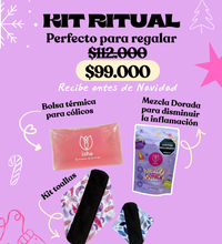 KIT RITUAL: Te incluye bolsa térmica para cólicos + mezcla dorada+ Ppack de toallas (1 para flujo abundante y una de flujo medio), todos los productos pensados especialmente en darte confort, bienestar, alivio, además todos tienen el tamaño perfecto para llevarlos contigo a donde vayas